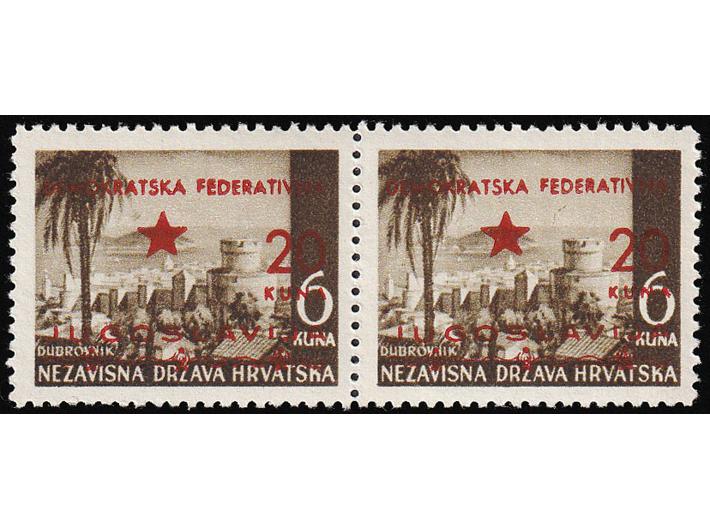 Opis: Provizorno izdanje za Split, vodoravni par 20/6 na papiru za offsetni tisak s vrlo izraženim probojem pretiska. Odlična kvaliteta.