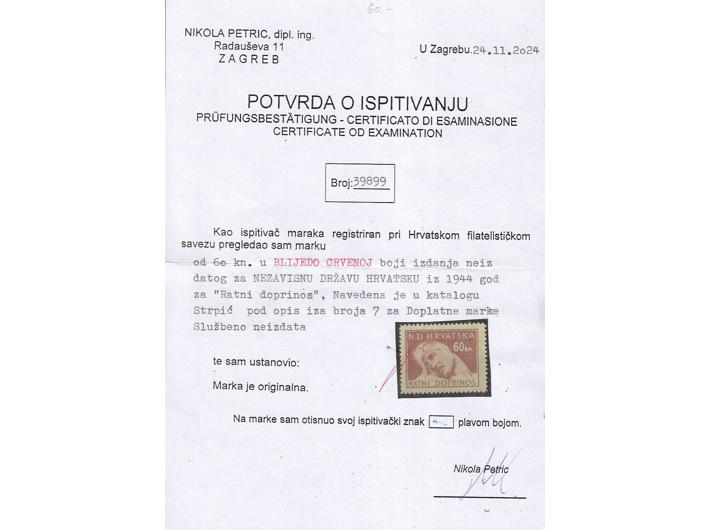 Opis: Ratna pomoć, neizdata marka 60 kn. Opisana u BP za NDH na str. 159. Fotoatest Petric, odlična kvaliteta.