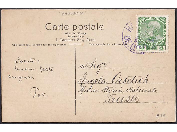 - Razglednica Adena upućena u Trst 1912 brodom HABSBURG OE. LLOYD.