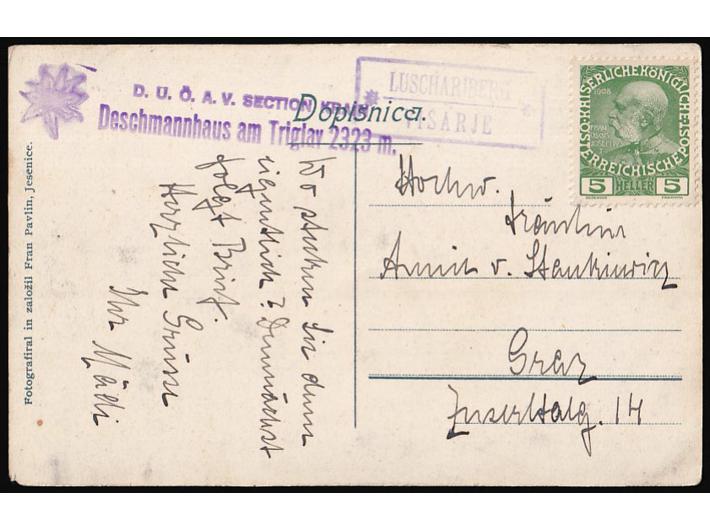 • Razglednica Aljaževog doma upućena iz poštanske agencije VIŠARJE u Graz.