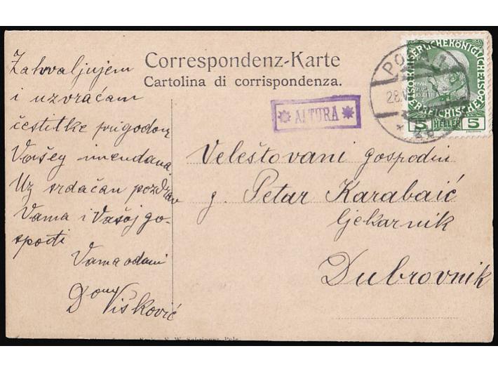 - Razglednica Alture upućena iz poštanske agencije ALTURA preko pošte Pula 28.06. 1911 u Dubrovnik.