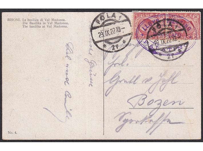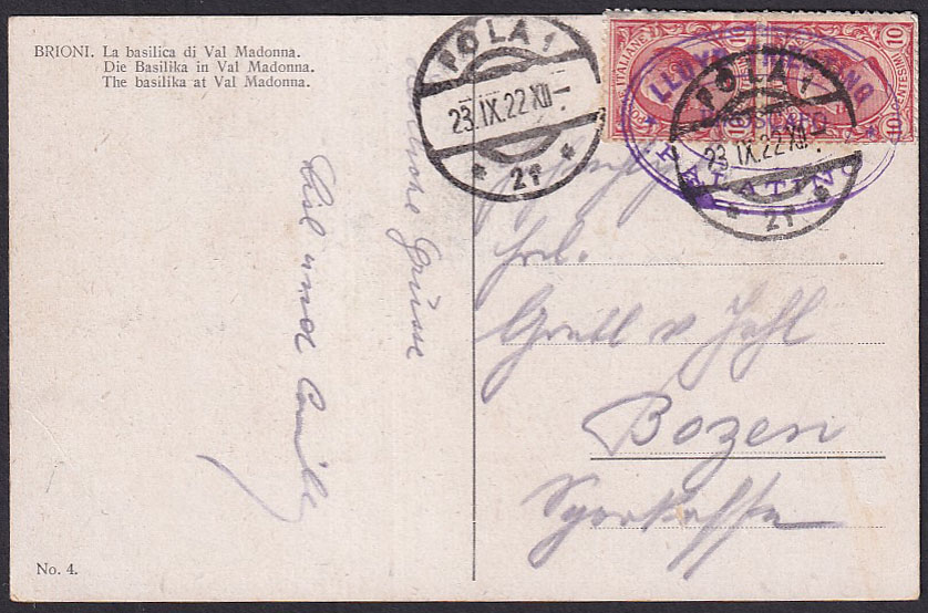 - Razglednica Briuna upućena s parobroda PALATINO Lloyda Triestino u Bolzano 23.09. 1922.