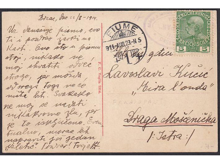 - Razglednica Glavotoka upućena brodom FRANKOPAN parobrodarskog društva u Puntu preko Rijeke 23.08. 1914 u Moščenićku Dragu.