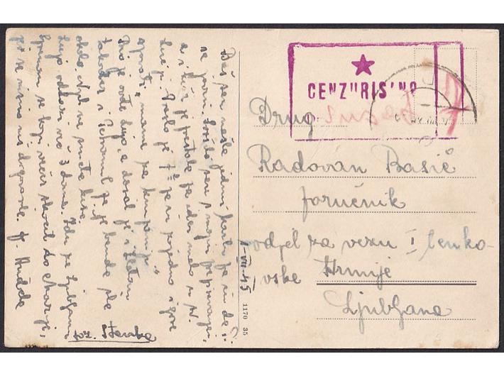 Opis: Razglednica Kostrene pisana 01.07. 1945 i upućena u Ljubljanu. Cenzurirana po vojnoj cenzuri na Sušaku.