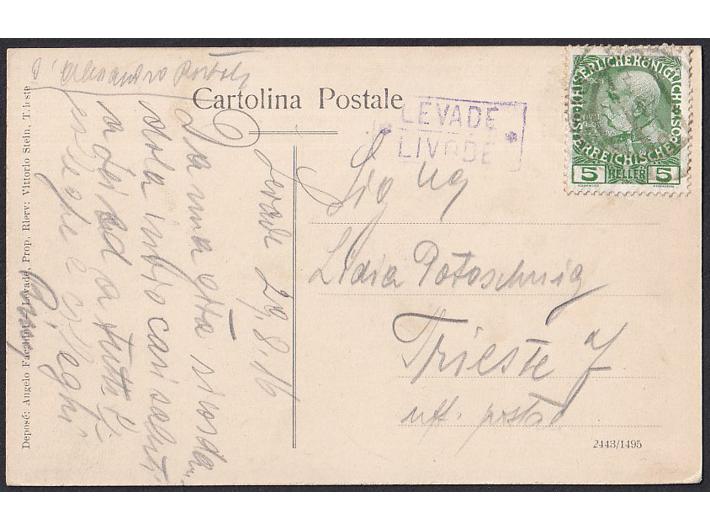 • Razglednica Livada upućena preko poštanske agencije LEVADE/LIVADE 29.08. 1916. u Trst.
