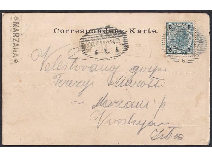Opis: Razglednica Moščenićke Drage upućena iz Opatije preko Vodnjana u Marčanu oko 1901. Tranzitni žig Vodnjana i dolazni poštanske agencije MARZANA.