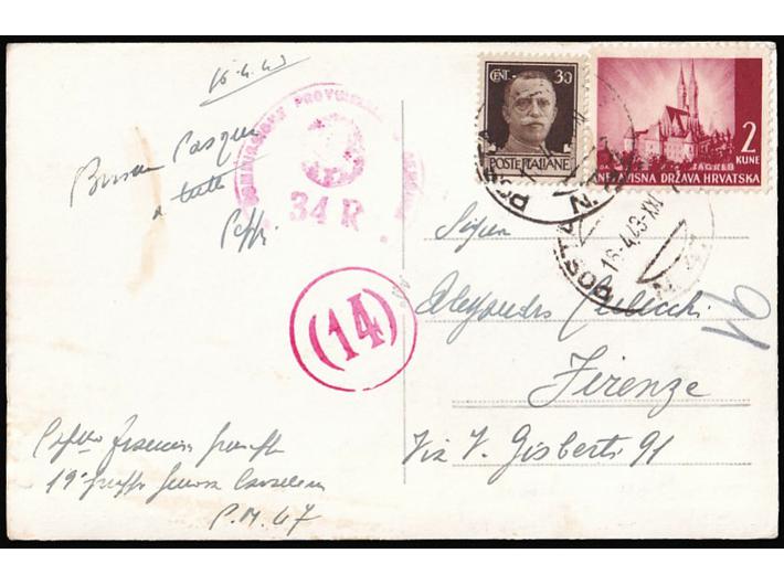 Razglednica Ozlja mješovito frankirana talijanskom i markom NDH te preko vojne pošte PM 47 upućena u Firencu 16.04. 1943.