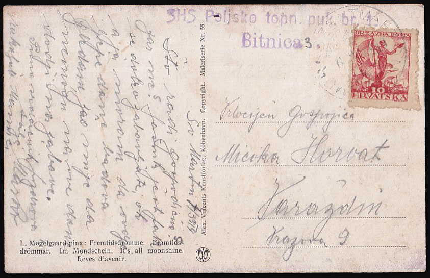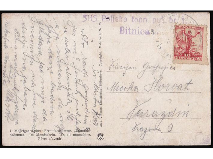 Opis: Razglednica pisana u Sv. Martinu na Muri 07.03. 1919 i upućena u Varaždin. Pošiljatelj je pripadnih S.H.S Poljsko topnički puk br. 1 / Bitnica 3.