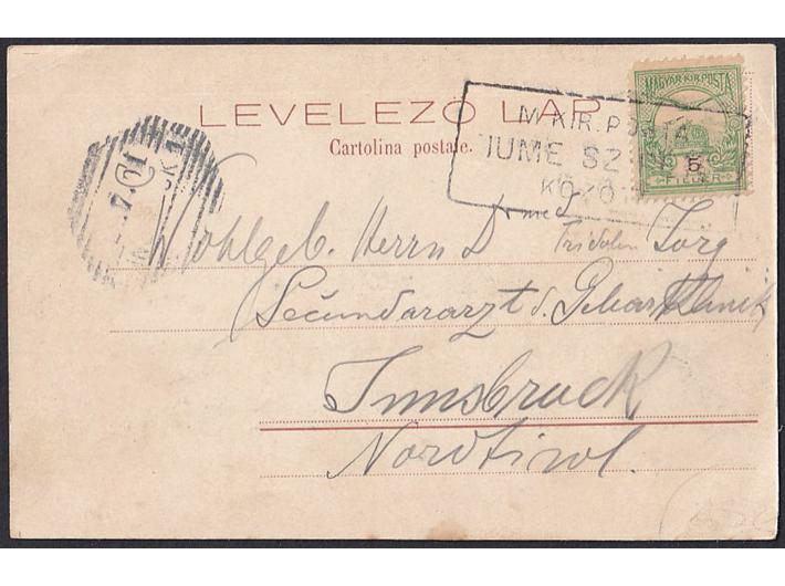 Razglednica Rijeke upućena iz Rijeke u Innsbruck 01.07. 1901 sa zanimljivim željezničkim žigom.