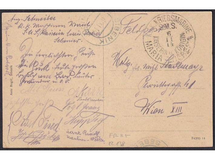 • Razglednica s prikazom slapova Krke upućena s broda S.M.S. MARIJA THERESIA preko pošte Šibenik 06.11. 1914 u Beč.