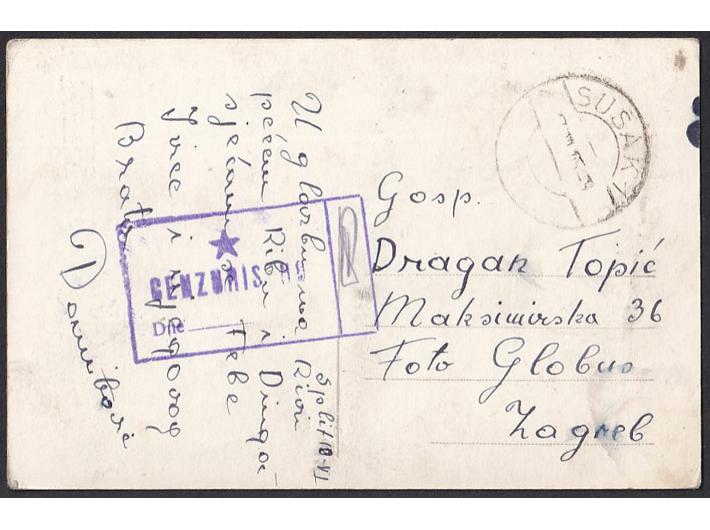 Opis: Razglednica Splita pisana u Splitu 10.06. 1945 i upućena sa Sušaka u Zagreb. Žig cenzure Sušak opisan u Acta Philatelica 2022 na str. 70, dobra kvaliteta.