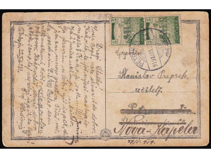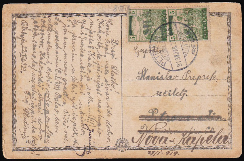 - Razglednica upućena iz Petrinje 22.01. 1919 u Novu Kapelu.