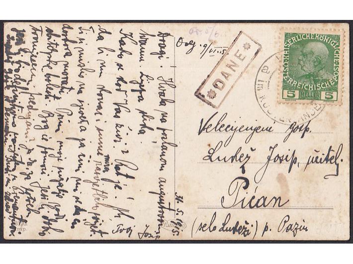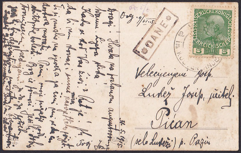 - Razglednica upućena iz poštanske agencije DANE u Pićan 31.05. 1915.