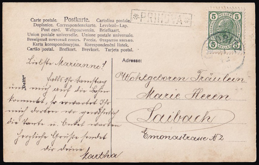 - Razglednica upućena iz poštanske agencije PRINOVA preko Gonobitz-a (Slovenske Konjice) u Ljubljanu.