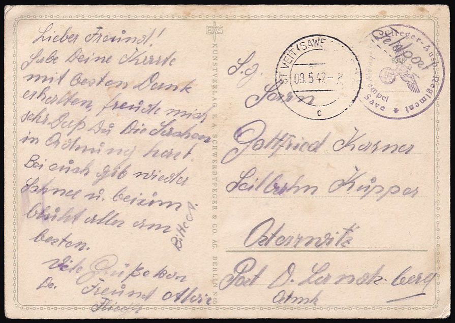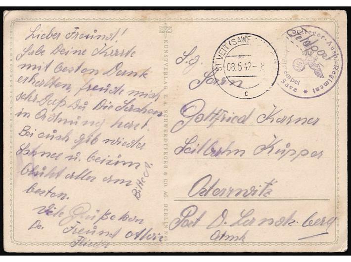 Opis: Razglednica upućena iz Sv. Vida na Savi u Austriju 08.05. 1942., preko njemačke vojne pošte 9 letačke izobrazbene regimente koja se nalazila u Sv. Vidu. Dobra kvaliteta.