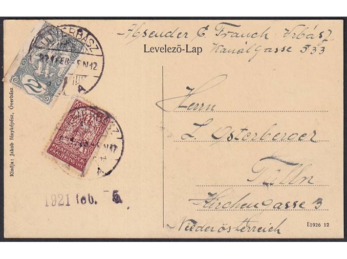 - Razglednica Vrbasa upućena u Austriju 05.02. 1921., frankirana novinskom markom od 2 vinara.