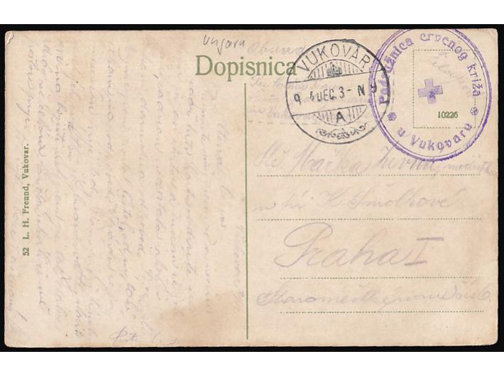 Opis: Razglednica Vukovara upućena iz Vukovara u Prag 03.12. 1914. Zanimljiv žig PODRUŽNICA CRVENOG KRIŽA U VUKOVARU. Dobra kvaliteta.