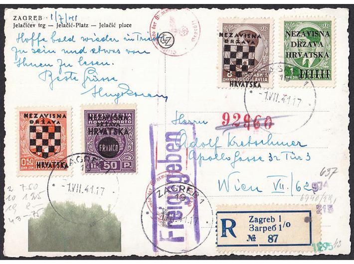 Opis: Razglednica Zagreba preporučeno upućena iz Zagreba 01.07. 1941. u Beč. Cenzurirana po OKW cenzuri. Frankirana višebojno trima provizornim izdanjima. Marka Michel br. 19 s pomakom pretiska. Žig Freigegeben (pušteno) jer su razglednice kontrolirane s obzirom na sliku koju prikazuju. Odlična kvaliteta.