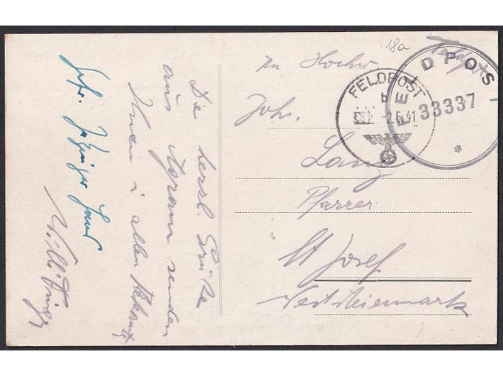 Opis: Razglednica Zagreba upućena u St. Jozef (Austija) 02.06. 1941 preko vojne pošte 33337 što je oznaka za Zagrebačku podružnicu vojnog auto parka sa sjedištem u Grazu. Vrlo rijetko, dobra kvaliteta.