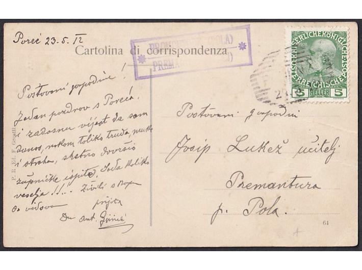 - Razglenica Poreča upućena 23.05. 1912 iz Poreča u Premanturu kod Pule.