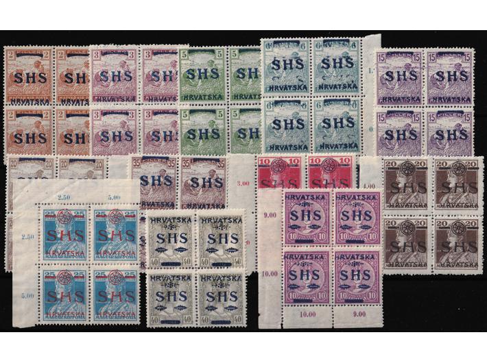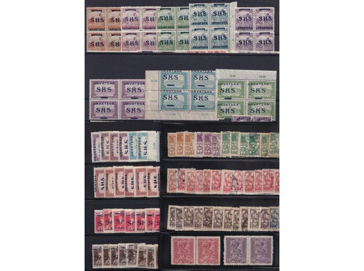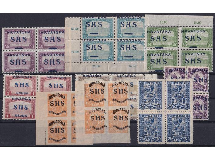 Opis: SHS Hrvatska, zanimljiv lot maraka. Četverac jedne vrijednosti krunidbene, četverci 29 listopad, žetelice i parlament u četvercima i druge zanimljive stvari.