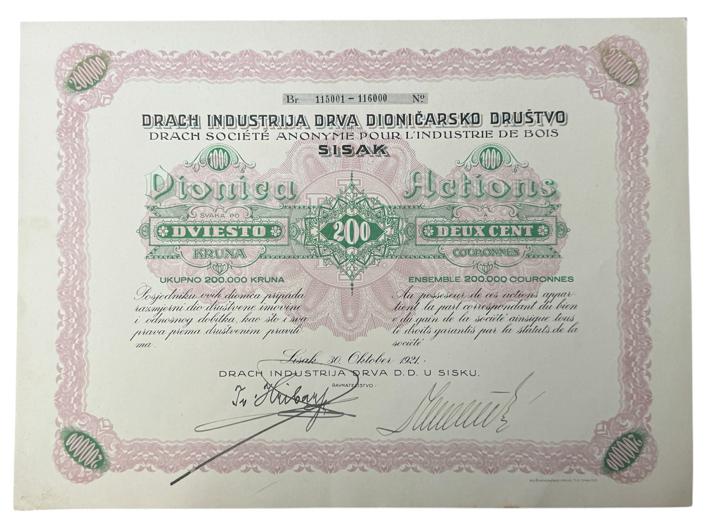 - SISAK, dionica "DRACH INDUSTRIJA DRVA D.D.", 200 kruna, 30. listopad 1921.