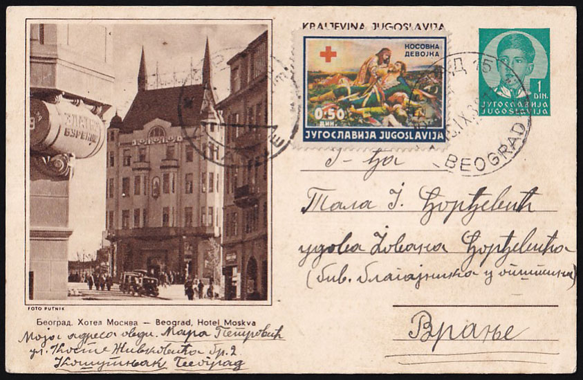 - Slikovna dopisnica dofrankirana doplatnom markom Crvenog Križa i upućena iz Beograda u Vranje 18.09. 1938.