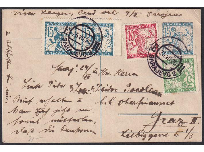- Slovenska dopisnica višebojno dofrankirana i upućena iz Sarajeva u Graz (Austrija) 25.07. 1920.