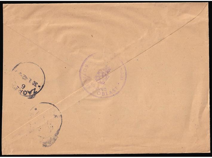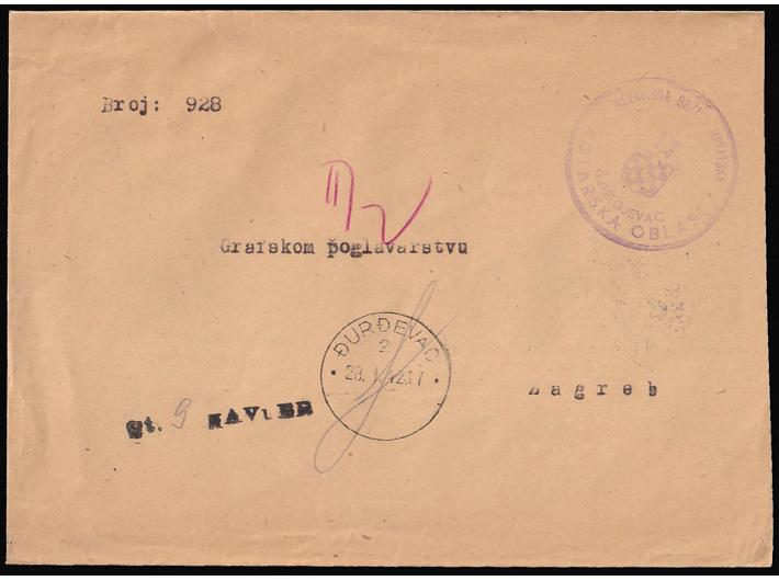 Opis: Službeno pismo upućeno iz kotarske oblasti Đurđevac u Zagreb 28.05. 1942. Poštarina na vjeru (kredit) što označava da je pismo upisano u poštansku knjigu na str. 5. Tranziti i dolaz na poleđini. Odlična kvaliteta.