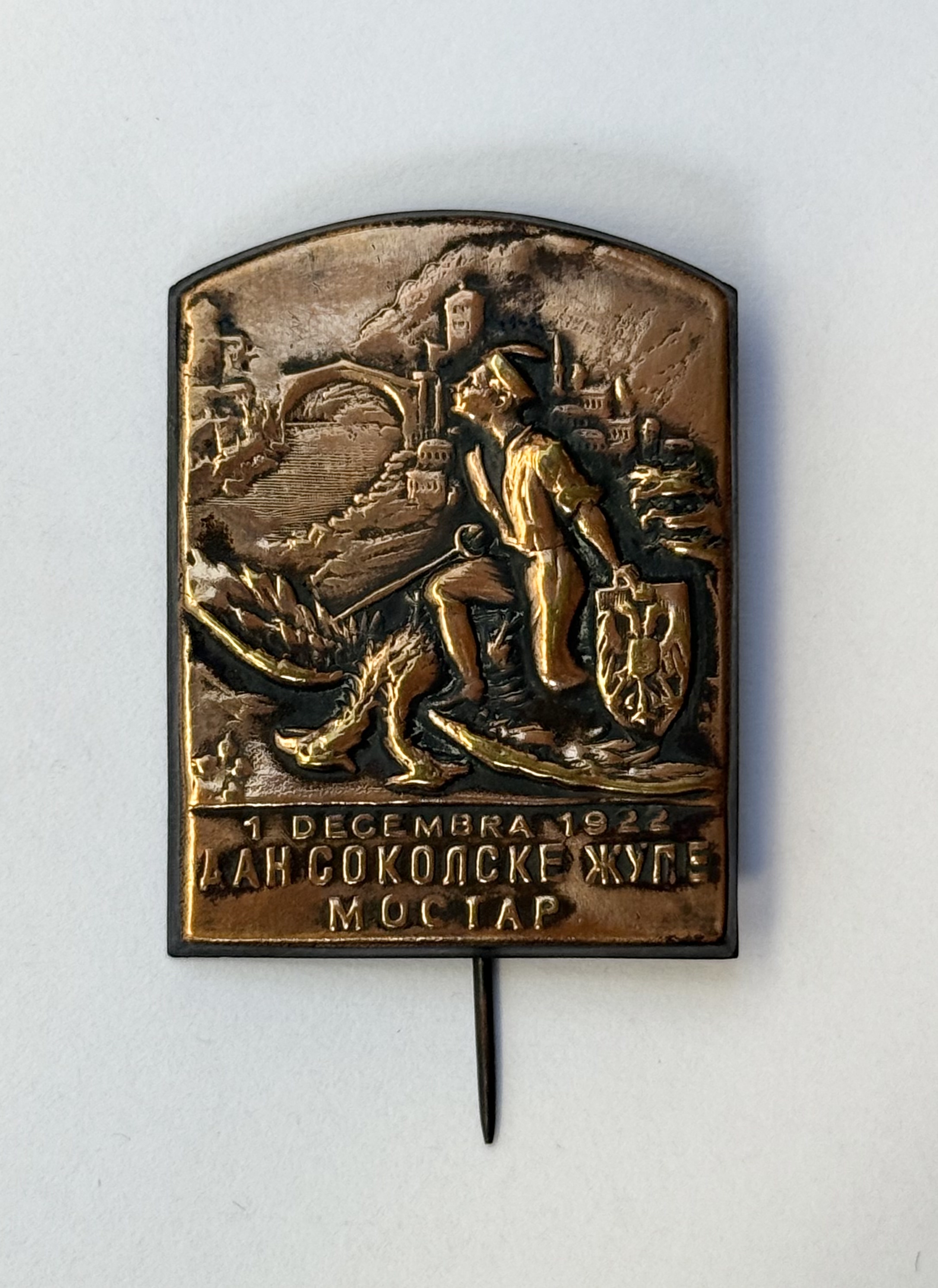 Opis: SOKOLI, značka, MOSTAR, 1922, dan mostarske župe, Cu - 30x40 mm