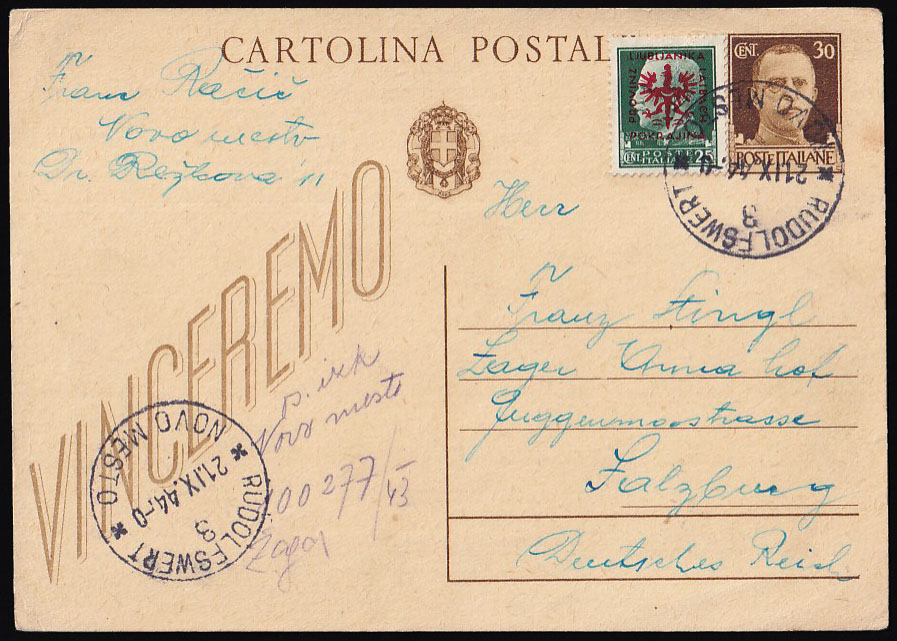 - Talijanska dopisnica dofrankirana provizornom markom njemačke okupacije Slovenije