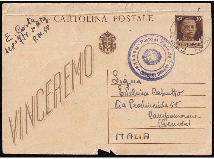 Opis: Talijanska dopisnica upućena 15.02. 1943 preko vojne pošte PM 10. Pisana u Novskoj od pripadnika jedinice za nadzor prometa što potvrđuje i žig Posto di Vigilanza Transporti / Nouska. Vrlo rijetko. Donji rub oštećen, gornji vodoravni trag savijanja.