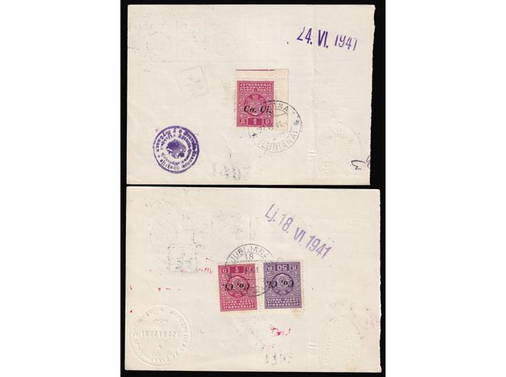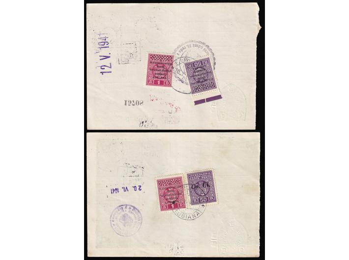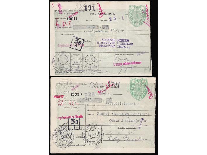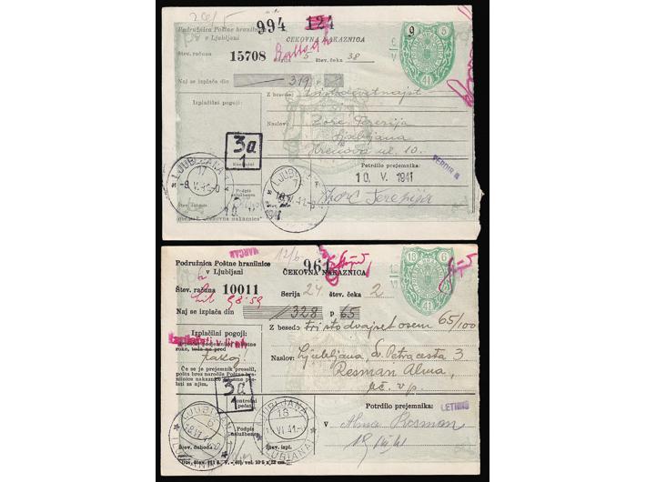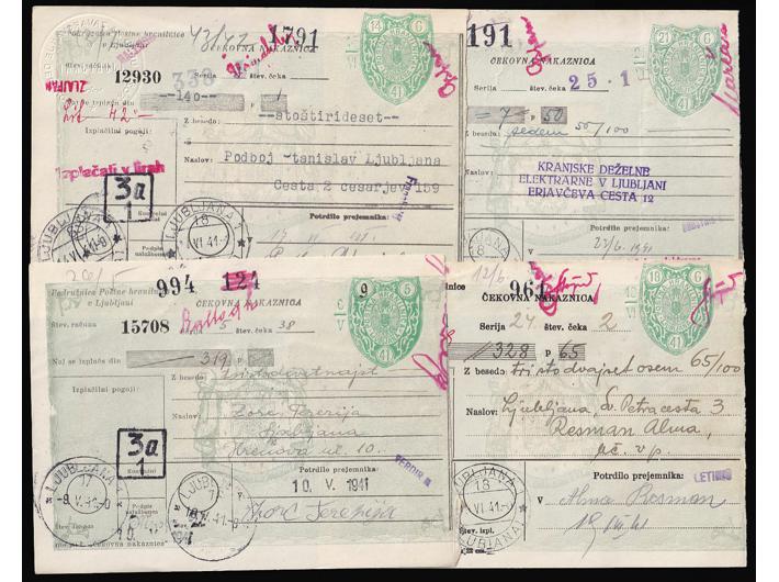 Opis: Talijanska okupacija, lot četiri čekovne uplatnice sve portirano raznim kombinacijama provizornih porto maraka talijanskog izdanja za Sloveniju. Odlična kvaliteta.