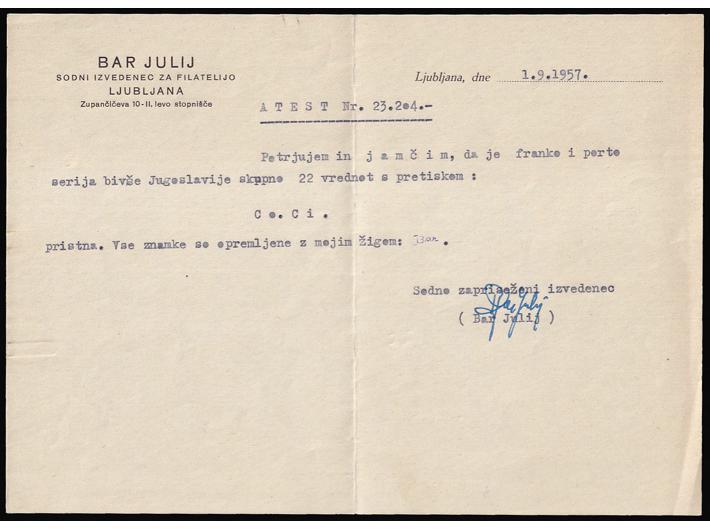 Opis: Talijanska okupacija, Michel br. 1/17 i porto 1/5 sve pretisak Co Ci odlična kvaliteta. Atest Br Julij.