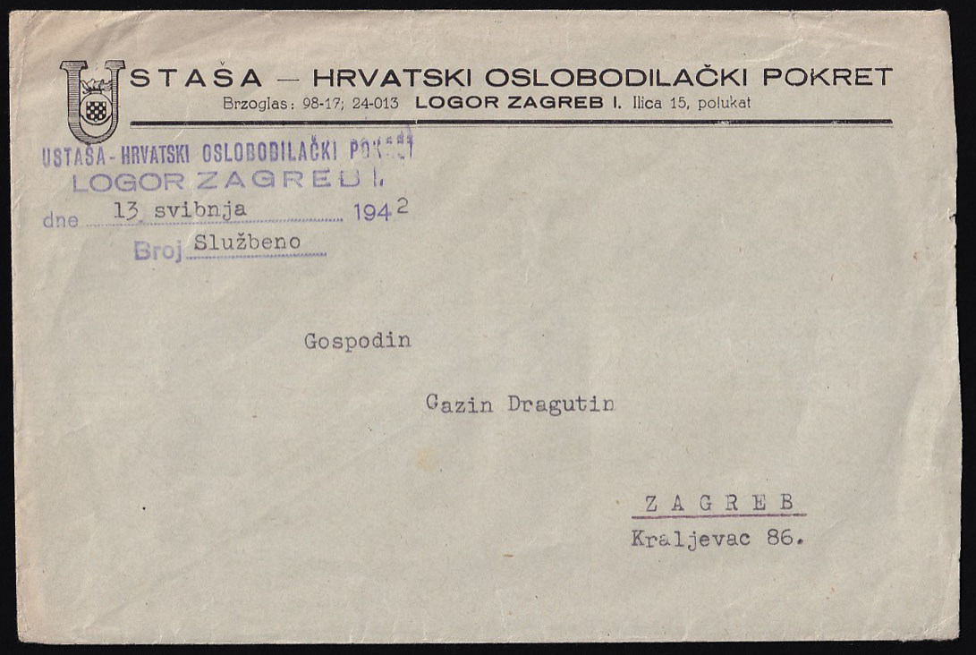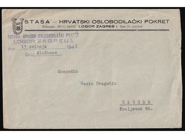 Opis: Tekličem upućeno službeno pismo iz Ustaškog logora Zagreb I u Zagreb 13.05. 1942. Odlična kvaliteta.
