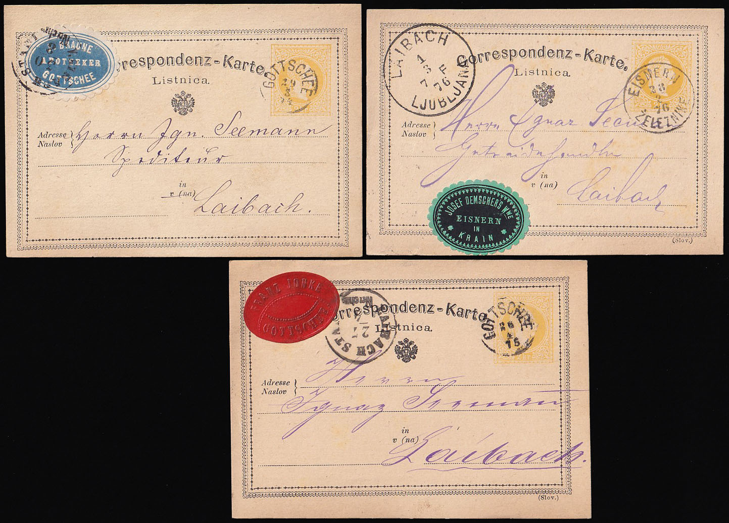 Opis: Tri dvojezične dopisnice s naljepnicama tvrtki upućene iz Kočevja i Železnog u Ljubljanu 1874, 1875 i 1876 godine. Dobra kvaliteta, atraktivno.