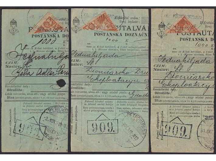 Opis: Tri odreska poštanskih doznačnica upućenih iz Petrovaradina. Sva tri frankirana polovicom marke 2 fill iz niza Mornari. Ovakovo frankiranje polovicom marke, a u svrhu povećanja cijene formulara opisano je u HFS br. 3 na str. 94.