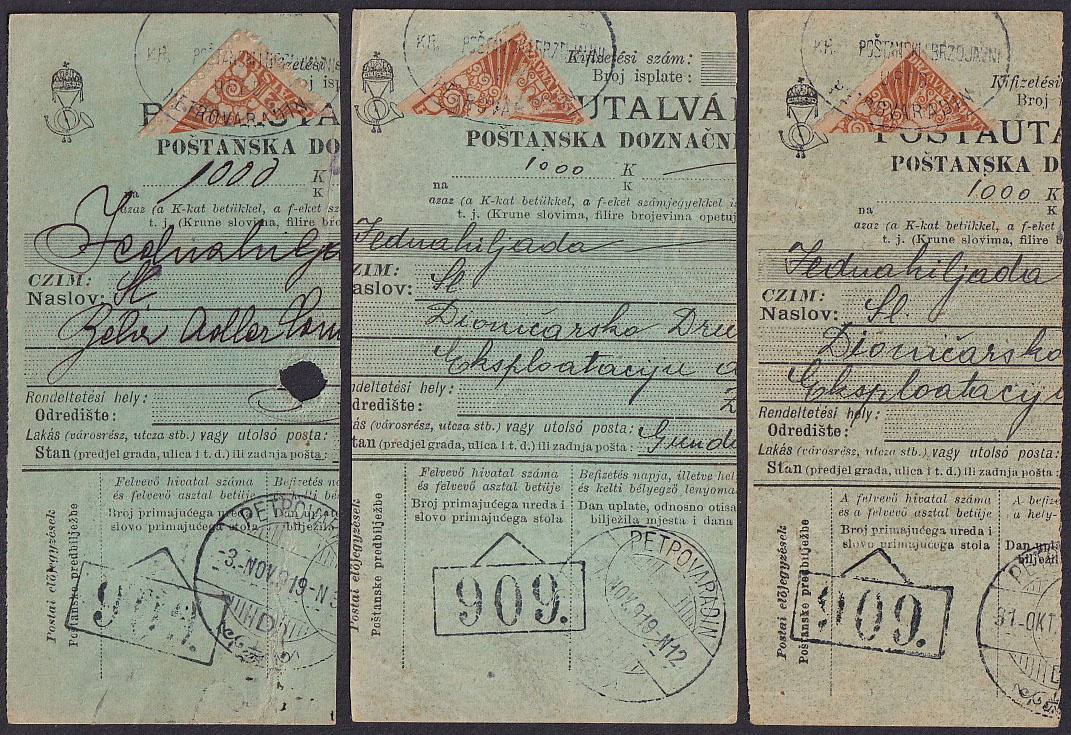 - Tri odreska poštanskih doznačnica upućenih iz Petrovaradina.