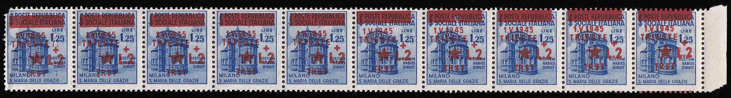 Opis: Vodoravni desetarac 1,25 + 2 lire s kosim pretiskom od lijeva na desno prema gore. Prva marka u nizu oštećen gornji lijevi kut.