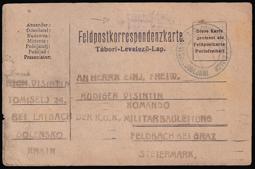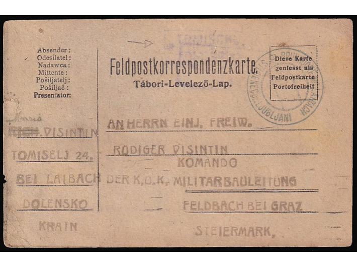 • Vojnopoštanska dopisnica upućena iz poštanske agencije TOMIŠELJ kod Ljubljane preko pošte STUDENEC pri LJUBLJAN u Feldbach kod Graza u Austriji.