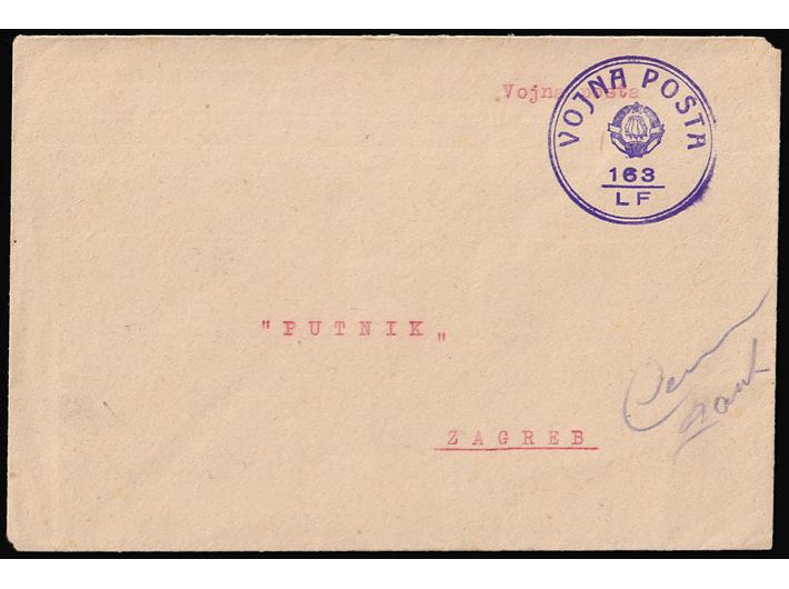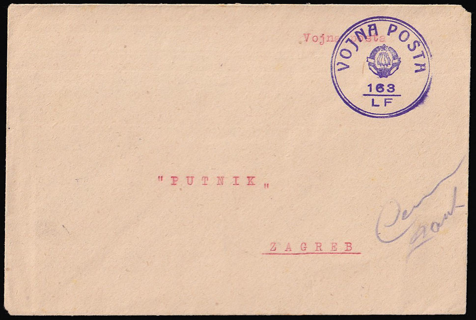 - Vojnopoštansko pismo upućeno iz vojne pošte 163/LF (IV armija, sanitet II bataljona) u Zagreb