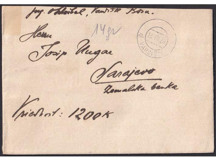 • Vrijednosno pismo upućeno iz Vardišta u Sarajevo 13.08. 1920.