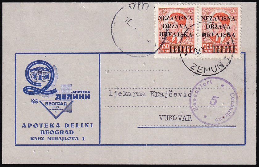 Opis: Vrlo zanimljiva poslovna dopisnica apoteke Delini iz Beograda koja nudi suradnju ljekarni Krajčević u Vukovaru. Upućena iz Zemuna 09.09. 1941, dolaz slijedeći dan u Vukovar. Cenzurirana po cenzuri Zemun 5 opisanoj u Pervan-Zrinjšćak na str. 56/58. Odlična kvaliteta.