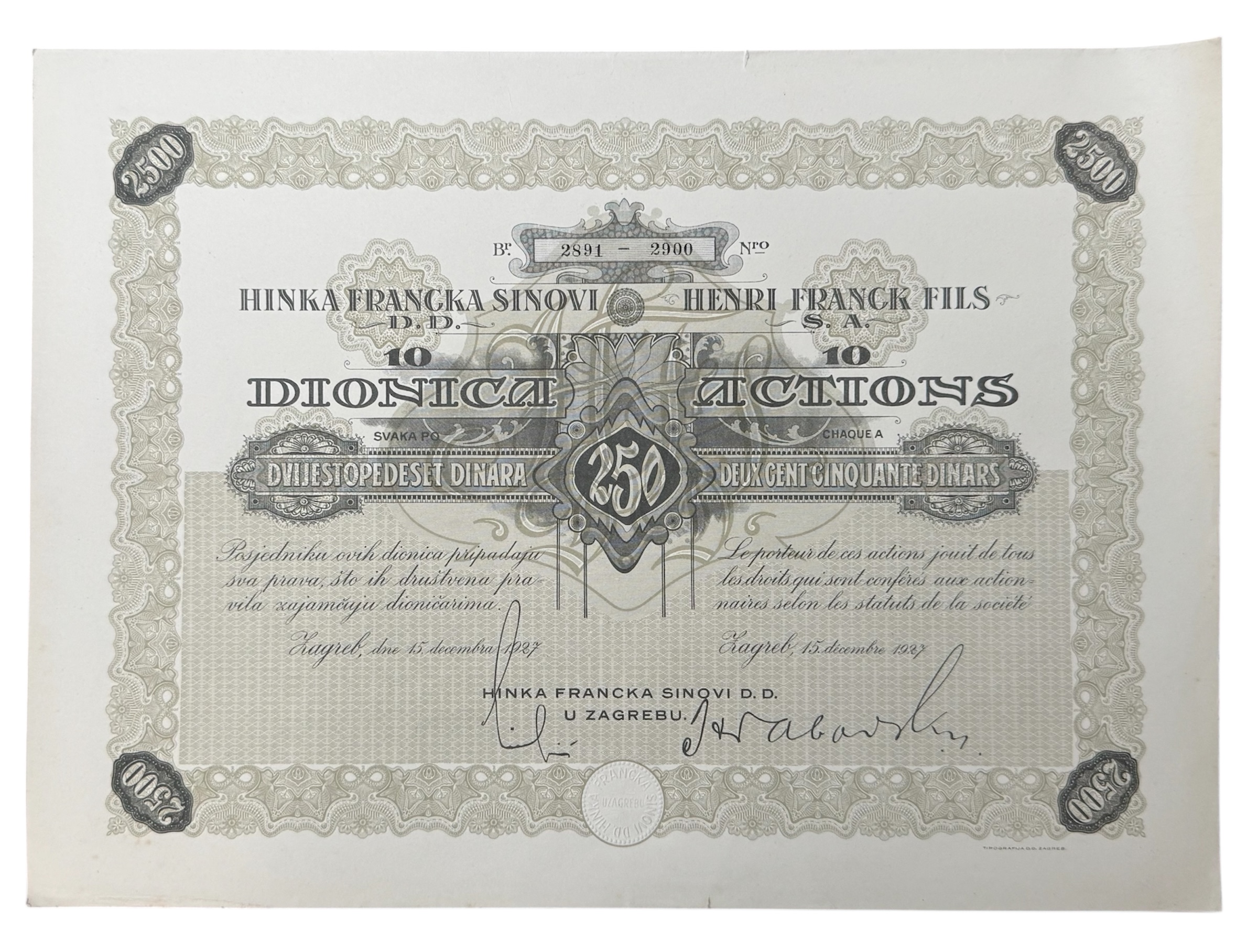Opis: ZAGREB, dionica "HINKA FRANCKA SINOVI D.D.", 250 dinara, 15. prosinac 1927. 34,5x25 cm