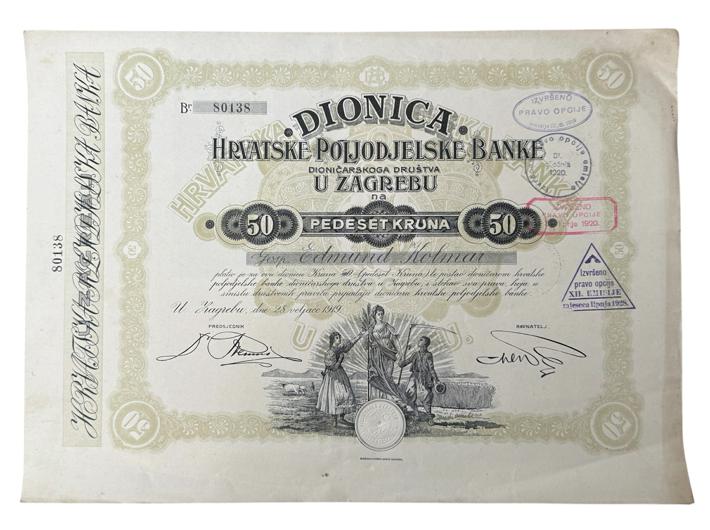 - ZAGREB, dionica "HRVATSKA POLJODJELSKA BANKA" d.d., 50 kruna, 28. veljače.1919.