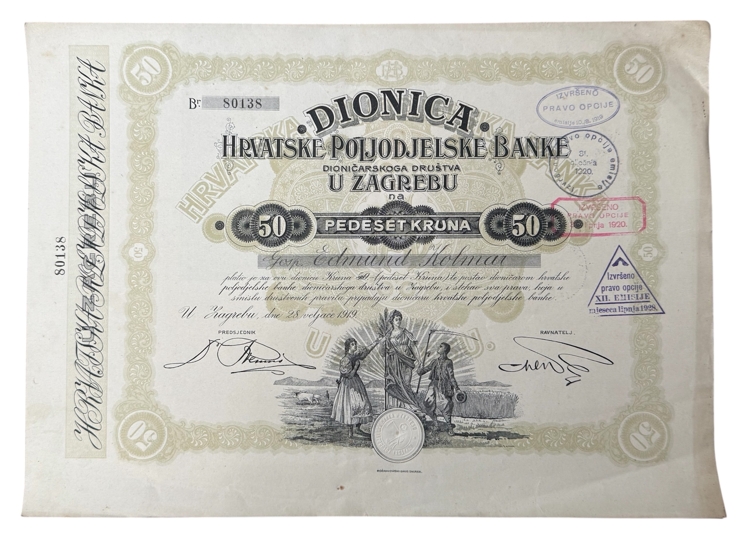 Opis: ZAGREB, dionica "HRVATSKA POLJODJELSKA BANKA" d.d., 50 kruna, 28. veljače.1919., 39,5x28,5 cm