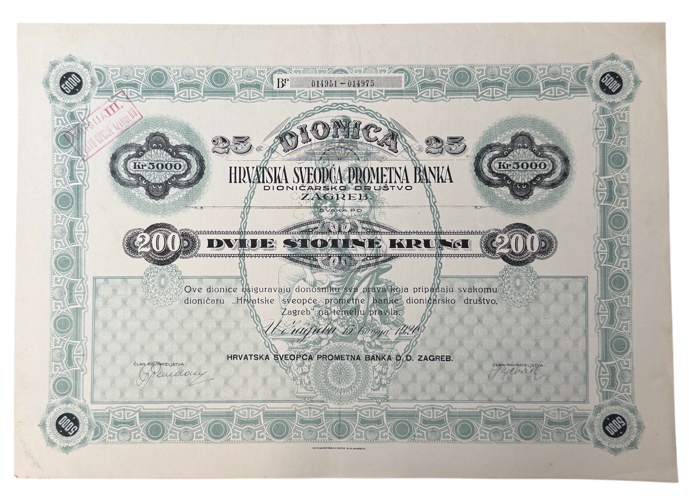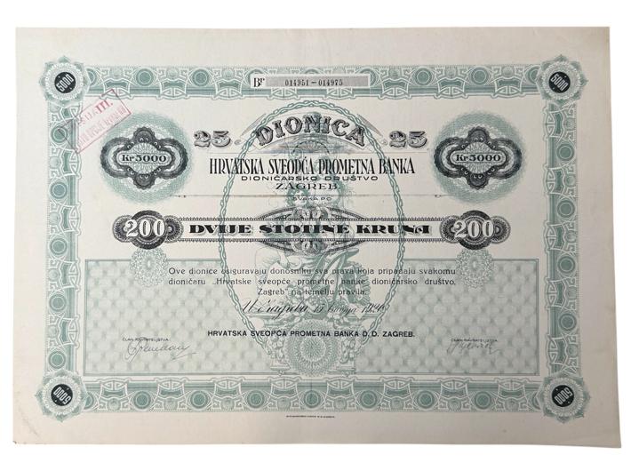 - ZAGREB, dionica "HRVATSKA SVEOPĆA PROMETNA BANKA D.D.", 200 kruna, 15. travnja 1920.