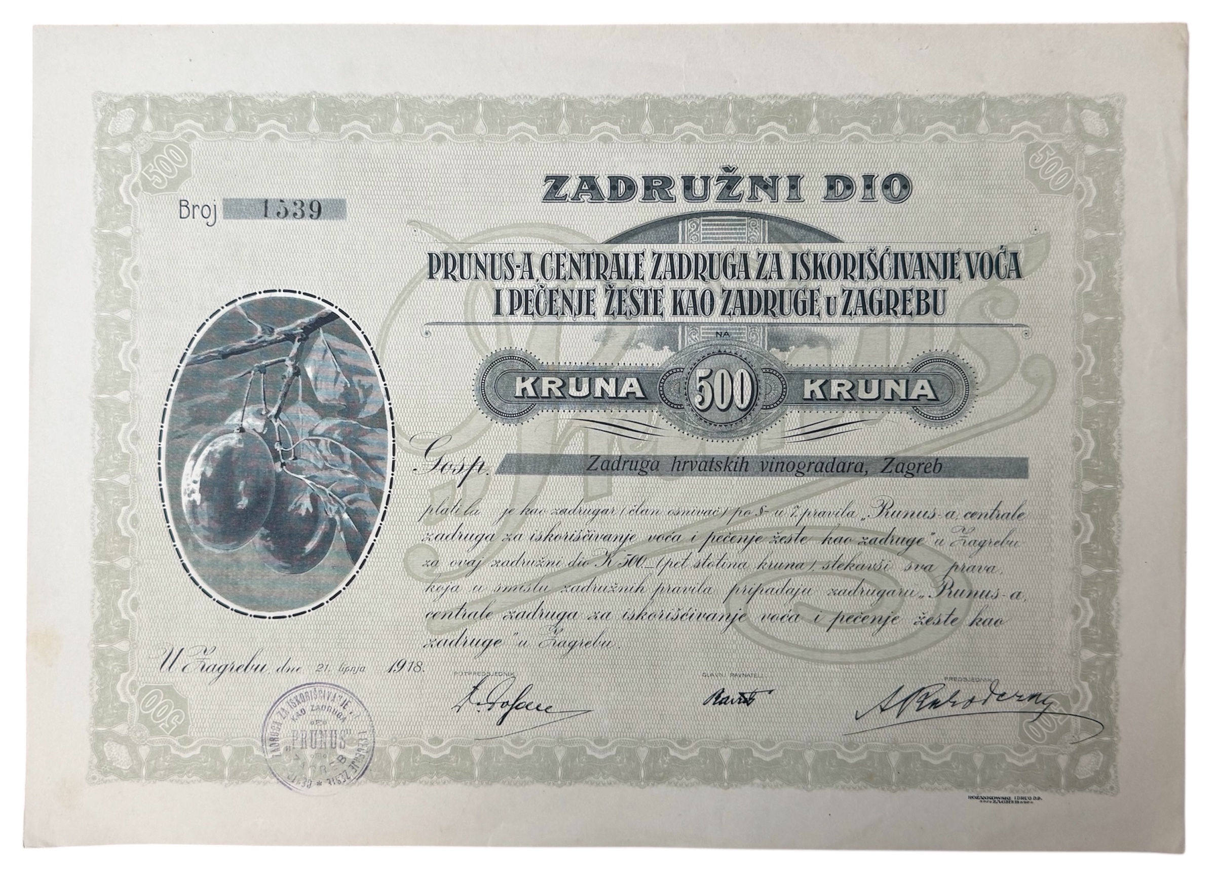 Opis: ZAGREB, dionica "PRUNUS-A CENTRALE ZADRUGA ZA ISKORIŠĆIVANJE VOĆA I PEČENJE ŽESTE", 500 kruna, 21. lipnja 1918., 40x28,5 cm