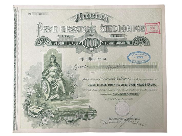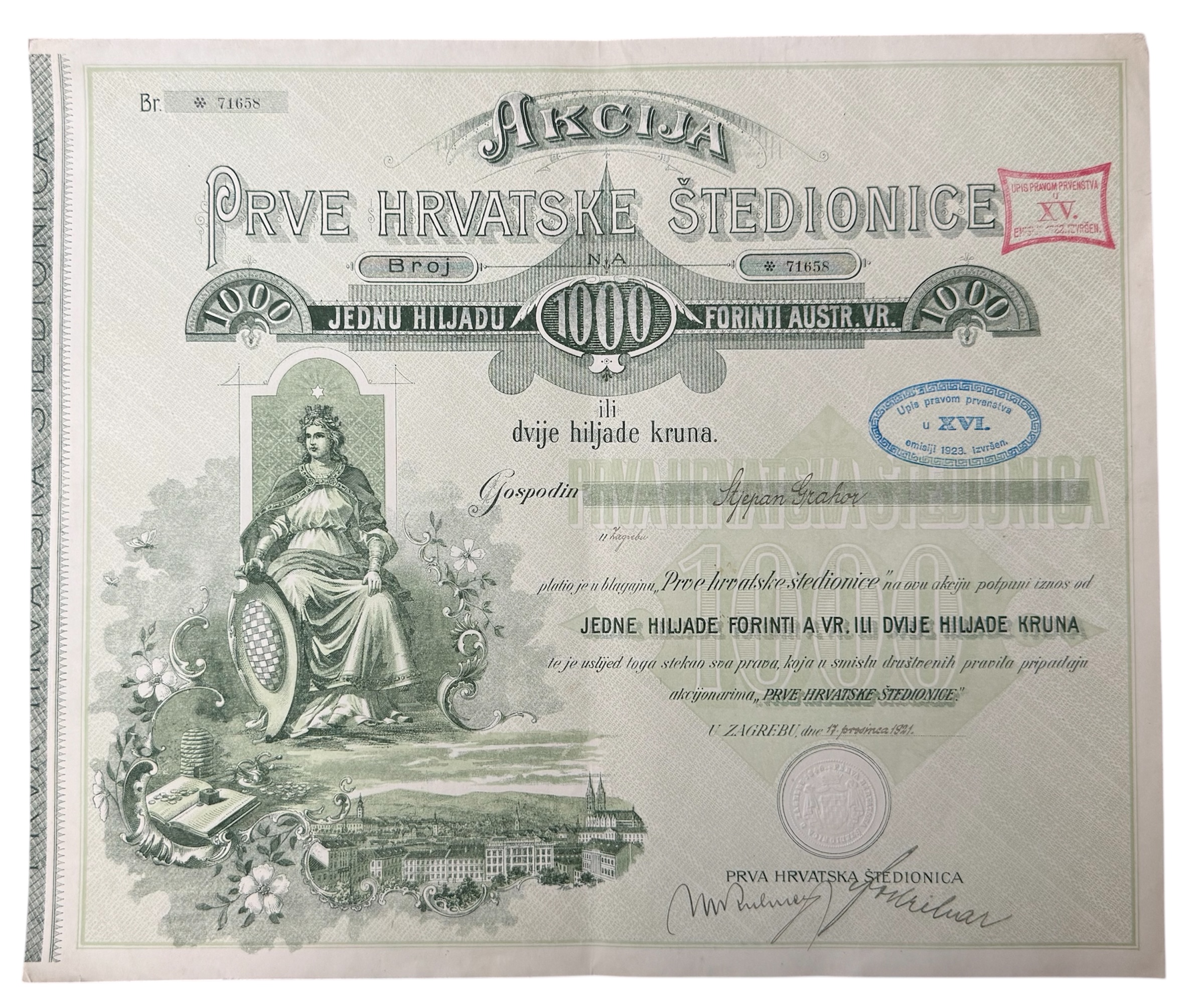 - ZAGREB, dionica "PRVA HRVATSKA ŠTEDIONICA", 1 000 forinti, 17. prosinca 1921.