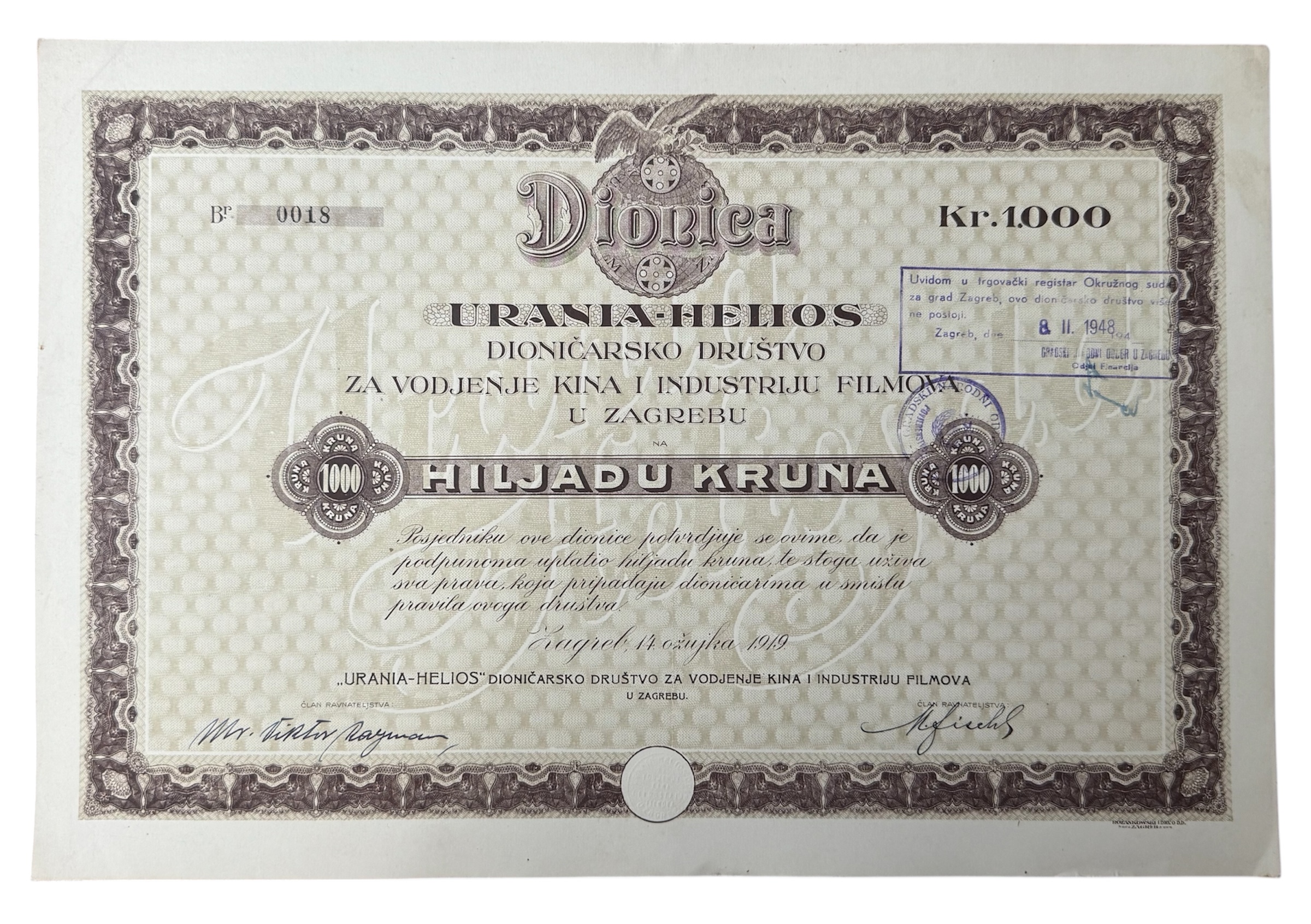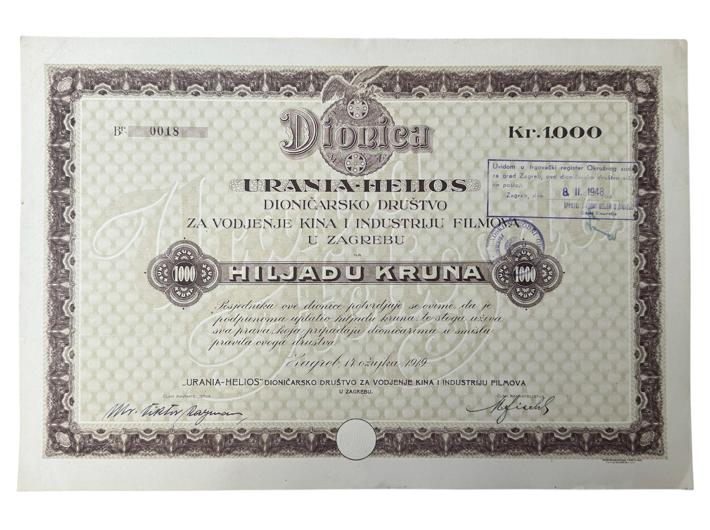 - ZAGREB, dionica "URANIA-HELIOS D.D. ZA VOĐENJE KINA I INDUSTRIJU FILMOVA", 1 000 kruna, 14. ožujka 1919.